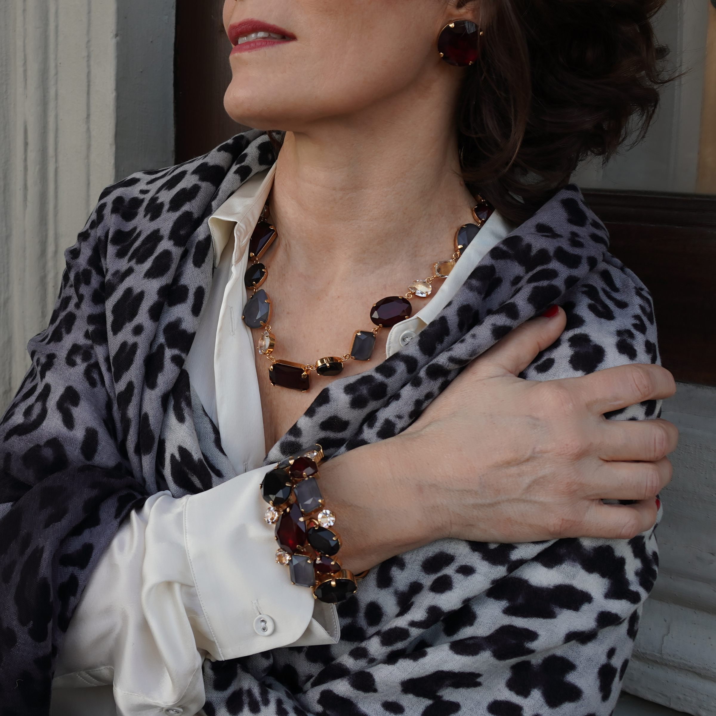 Bracciale interamente realizzato a mano, in ottone placcato oro con cristalli dipinti a mano e pietre Swarovski©.