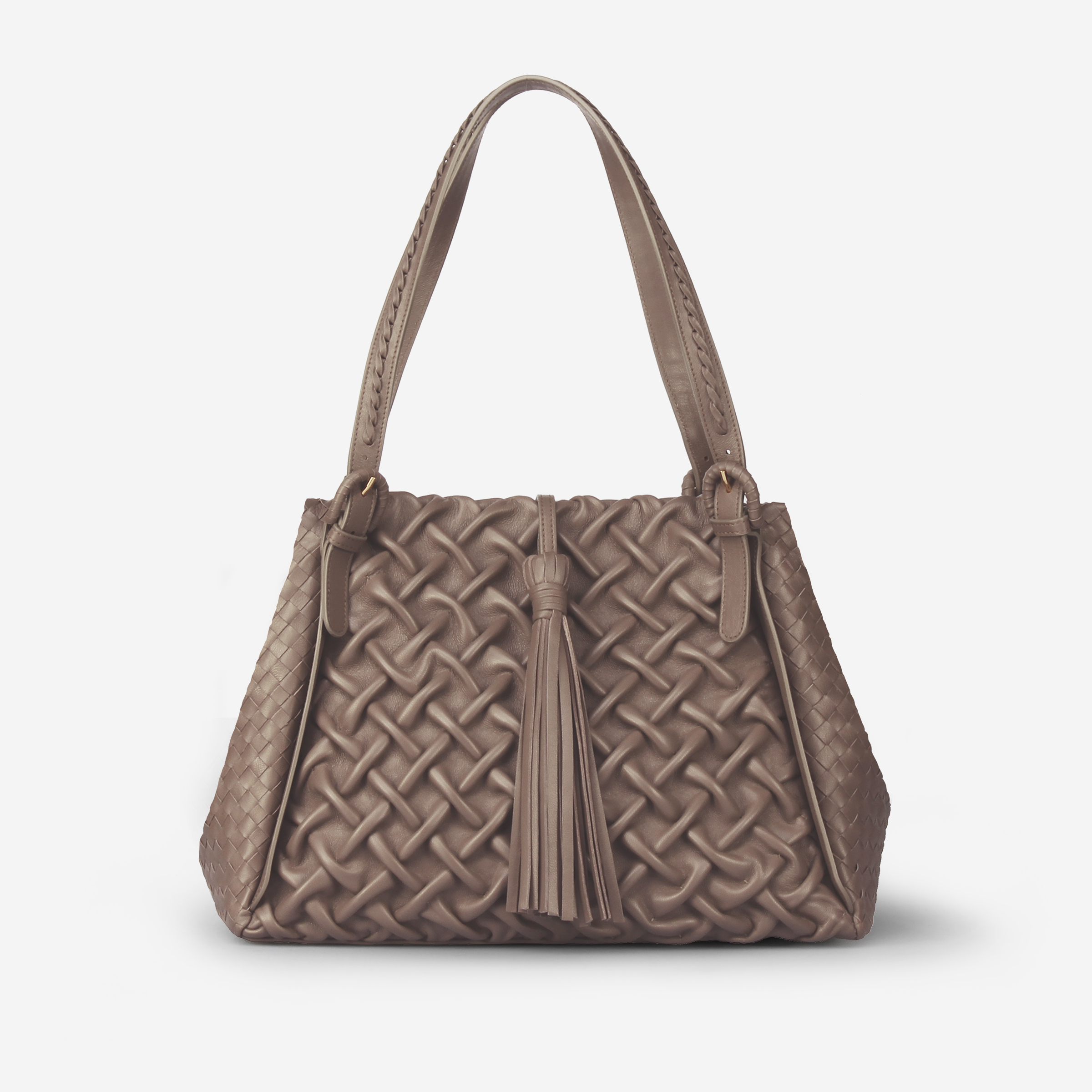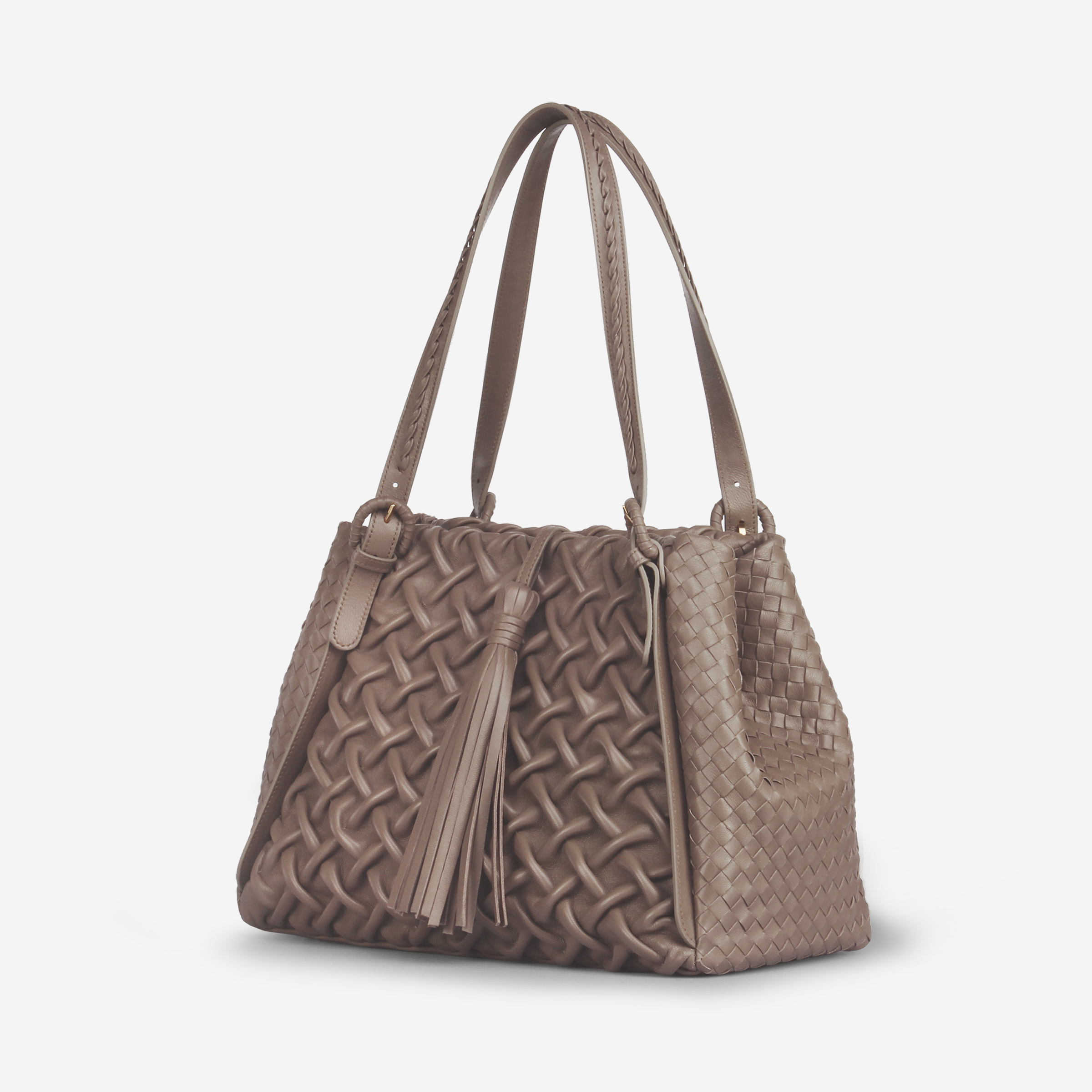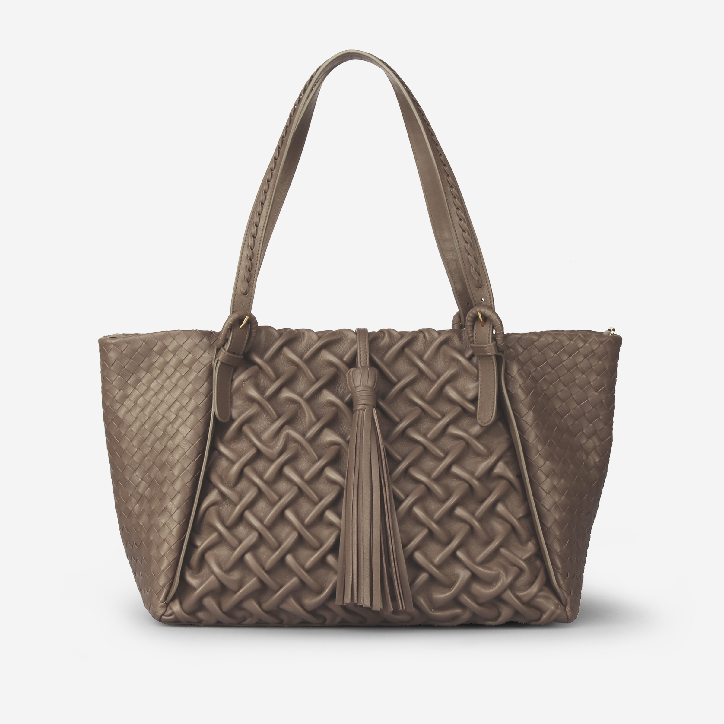This spacious tote bag, made in our Feather Light© nappa leather, is the result of the best italian leather craftsmanship. The front and back are hand stiched in our carrè motive while the sides are woven leather. It is enriched by a beautiful tassel and a hand stiched motive on the two handles. The inside, fully leather-lined, features one main compartment with a flat zip and a phone pocket and a magnet closure.